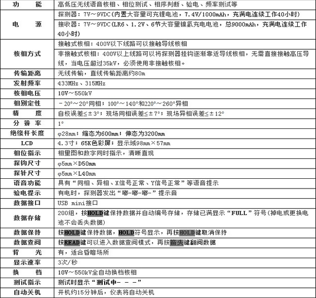 RT9000智能無線高低壓核相儀是一款全智能無線高低壓語音核相儀,突破傳統核相儀電壓等級限制問題,可以在極地電壓線路中核相,完全實現從10~550KV電壓自動核相(如400V、10KV、35KV、66KV、110KV、220KV),無需根據電壓等級購置多套核相儀或分別配置高低壓探測器,節省成本、減少攜帶、省時快捷。對于高壓線路核相(電壓超過400V),可將探測器的金屬探鉤逐漸靠近導線,當感應到電場信號即可完成核相,無需直接接觸高壓導線,安全!本儀器還具有測試相位、頻率、相許、驗電、變壓器組別判斷等功能。